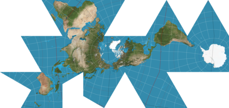 This map is a representation of the Earth's surface that, when folded up, forms an icosahedron: a 20-sided 3D shape whose faces are all equal equilateral triangles. In addition, it minimizes the land areas split up when unfolded.