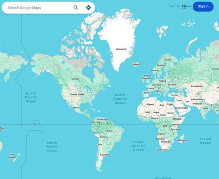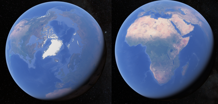 Note how Greenland and Africa appear comparable in size. In reality, Africa is about 14x larger than Greenland by land area. Here's what they look like in Google Earth, where the Earth is viewed as a sphere instead of a flat surface.