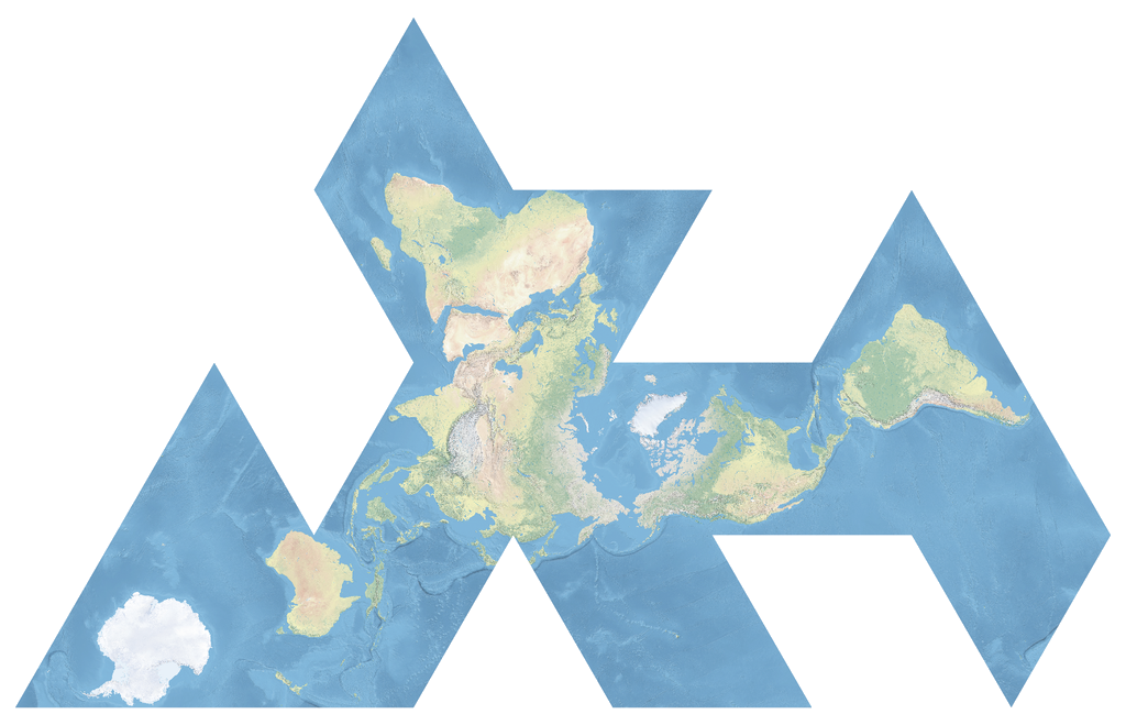 This project was inspired by the Dymaxion map [Wikipedia], created in 1954 by American architect Buckminster Fuller and Japanese cartographer Shoji Sadao. It was greatly aided by Unfolding the Earth: Myriahedral Projections, a paper by Professor van Wijk of the University of Eindhoven which presents the key algorithm used.